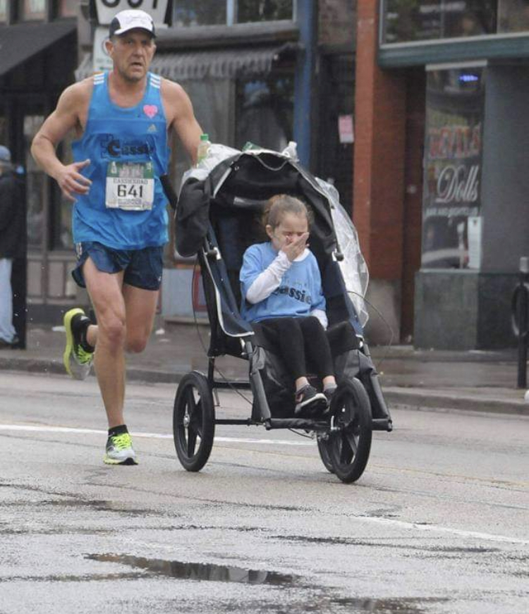 My brother made a return to serious running in 2013, when he ran the Pittsburgh Marathon in 3:43, BLINDFOLDED! He repeated the feat the next years raising thousands for charity. In 2016, he pushed his daughter, Cassie (she is blind and has autism) in a stroller and finished in 3;29 and two weeks later ran the Cleveland Marathon in 3:08. In 2017, Mike and Cassie finished the Children’s Marathon, they don’t know their finishing place, but they did end up on ESPN SportsCenter’s Top 10 Plays of the Day at #8.