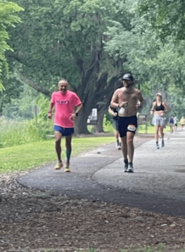 Once noon rolled around, the sun was high and humidity had built significantly. I ran outside the path along the treeline to stay in the shade, adding distance but avoiding the intense heat. I knew these little advantages would pay dividends. Still, around 30 miles in, the heat was beginning to wear me down. This is where Tony forced me to put a hat on. “Squinting in the sun makes your brain think you are more tired that you are.” Now I don’t know if there is science behind that, but I am now a firm believer. I felt an increase in energy almost immediately and was able to cruise for most of the afternoon. Due to a recommendation from another runner and in a rare moment of being able to put my ego aside, I added in short intervals of walking to use different muscles and maintain energy.