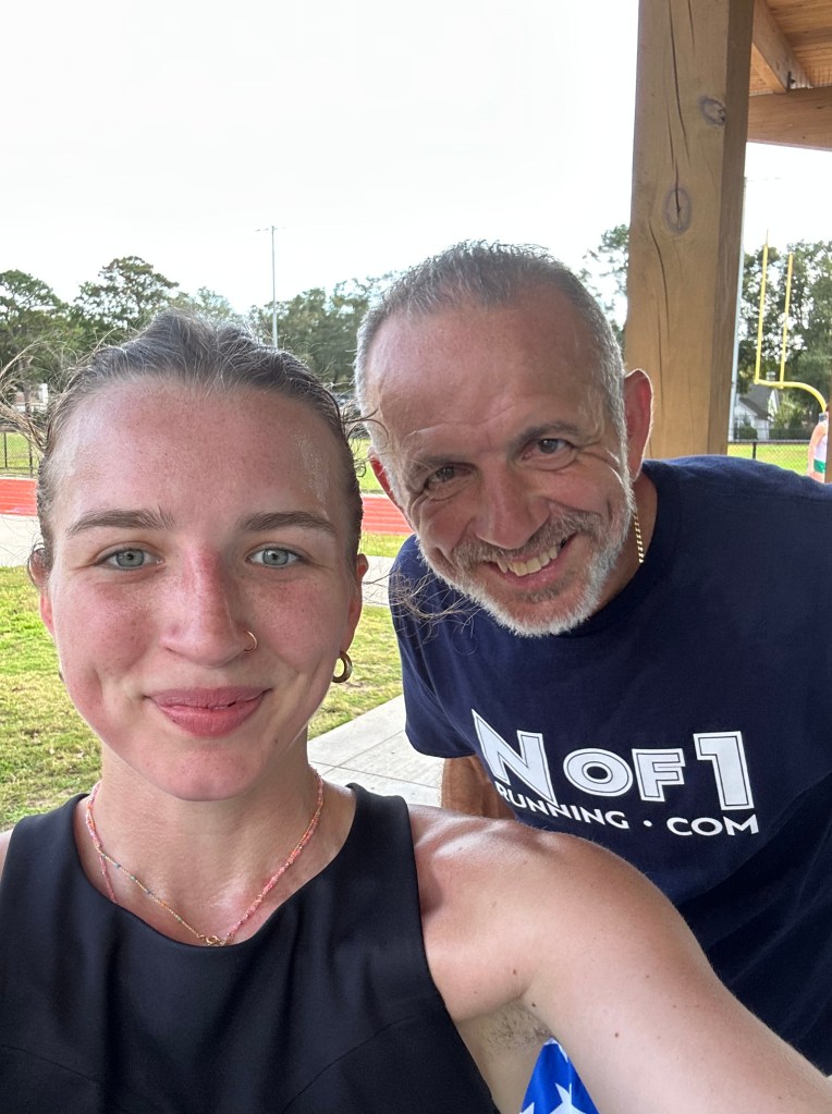 Naturally, my dad dropped everything he was doing to drive 2+ hours just to hang out with me for a couple hours … just like old times! He arrived at my hotel, ran on his own while I was finishing up with work then we set out for a 10 miler together. This is the first time I had run with my dad in years and we were both smiling ear to ear. We talked a lot about my training and he asked if I felt ready and I said “Yeah I think so, but I’m nervous” and he said “No you’re not, you’re excited” — so right then and there I decided I was excited. As we continued to make our way across the Charleston bridge, my dad mentioned that I had some potential competition in the Buffalo Run. Since this is my first race, I decided not to worry about the competition and press on. We ran all the way to Mt. Pleasant, took a lap on the track my dad set his 50 mile record on, and took a selfie. He said this was his favorite run of 2024 which made my heart happy.
